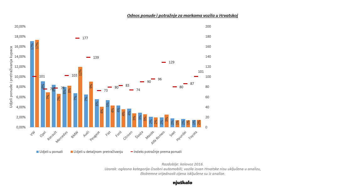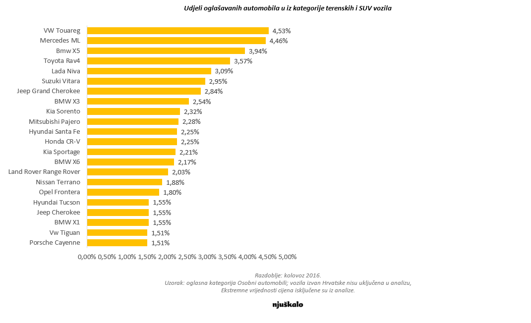 Na Njuškalu je tijekom kolovoza predano čak 33 tisuća novih oglasa osobnih automobila. Prema karoseriji vozila, najviše su to kompaktne klase i limuzine. Prema tipu goriva, najveći broj odnosi se na dizel, a prema marki vozila najviše na Volkswagen. Također, zabilježen je najveći rast ponude terenskih i SUV vozila, čiji udio iznosi 7 posto. Gledano unutar segmenta tog segmenta, najveća ponuda odnosi se na Volkswagen Touareg i Mercedes ML klase. Pritom, najveći udio oglašavanih vozila je iz 2007. i 2008. godine.
