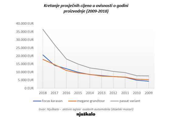 Usporedili smo kretanje cijena tri najzastupljenija modela karavana, s obzirom na godinu proizvodnje. U analizu su ušli samo oni s dizelskim motorom. Od navedenih modela, najveću prosječnu cijenu ima VW Passat Variant, koji je od ostala dva modela u prosjeku skuplji 50 do 60 posto. Gledamo li one s godinom proizvodnje 2016., prosječna tražena cijena Passata s dizelskim motorom se kreće oko 18 tisuća eura. Prosječna cijena Forda Focusa istog godišta iznosi 12 tisuća eura, dok je Renault Megane za oko tisuću eura povoljniji. Zanimljivo, ako pratimo period zadnjih 10 godina po godini proizvodnje, vidljivo je da cijena najsporije pada Renault Meganeu. Tako je, za primjer, cijena Meganea Grandtoura iz 2009. za oko 71 posto niža od onog iz 2018. godine.