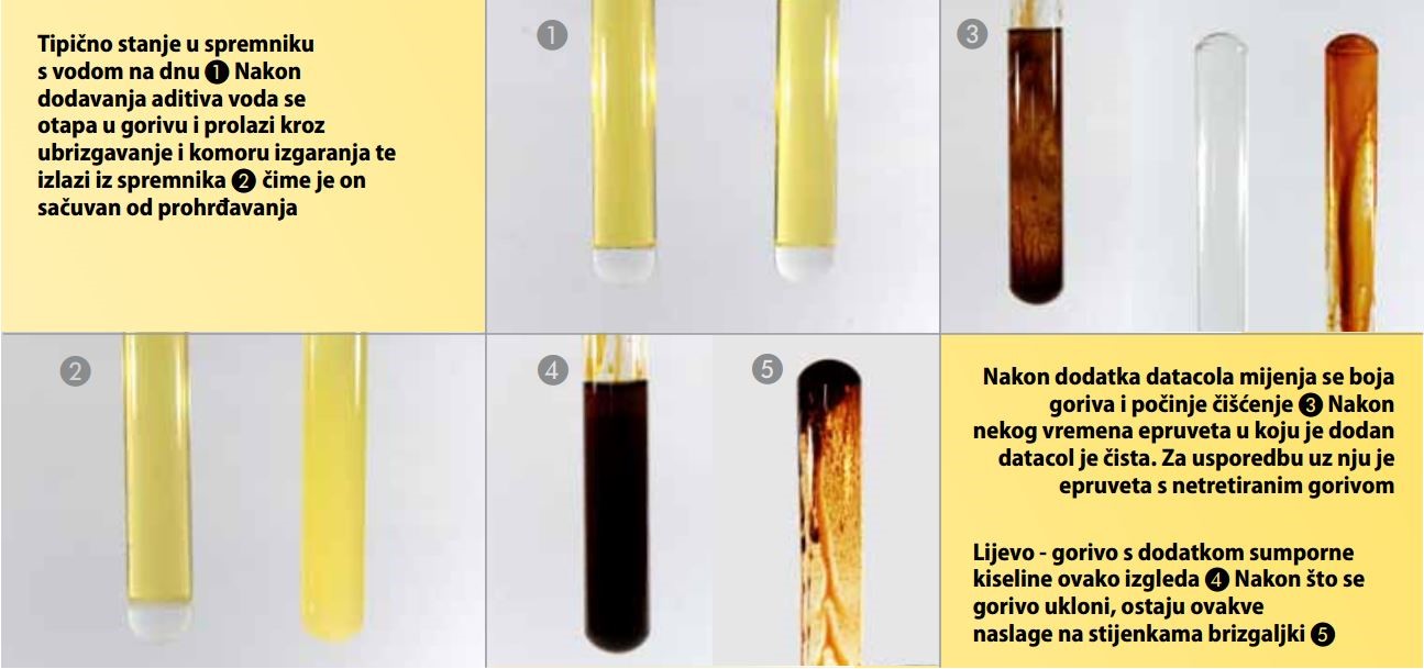 Jednostavni testovi s epruvetama pokazuju kako Datacol otapa nataložene naslage sumporne kiseline te čisti stijenku epruvete. Drugi test dokazuje da on emulzionira vodu u gorivu, te tako omogućuje izbacivanje vode iz sustava kroz vožnju, odnosno motor. I za kraj, smanjuje i pjenjenje goriva.