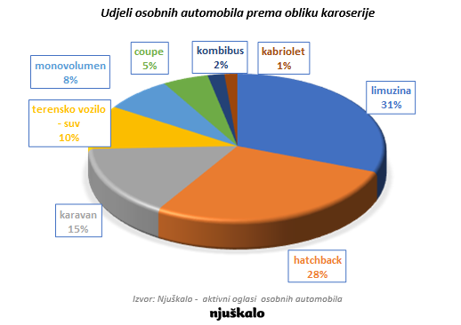 Gotovo trećina oglašenih osobnih automobila su limuzinske izvedbe, dok se unutar 3 najzastupljenije karoserije nalaze još i hatchback modeli te karavani.