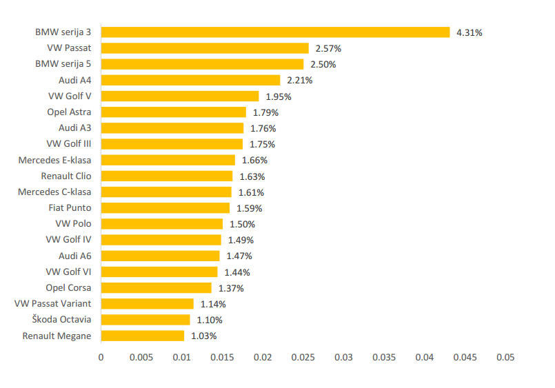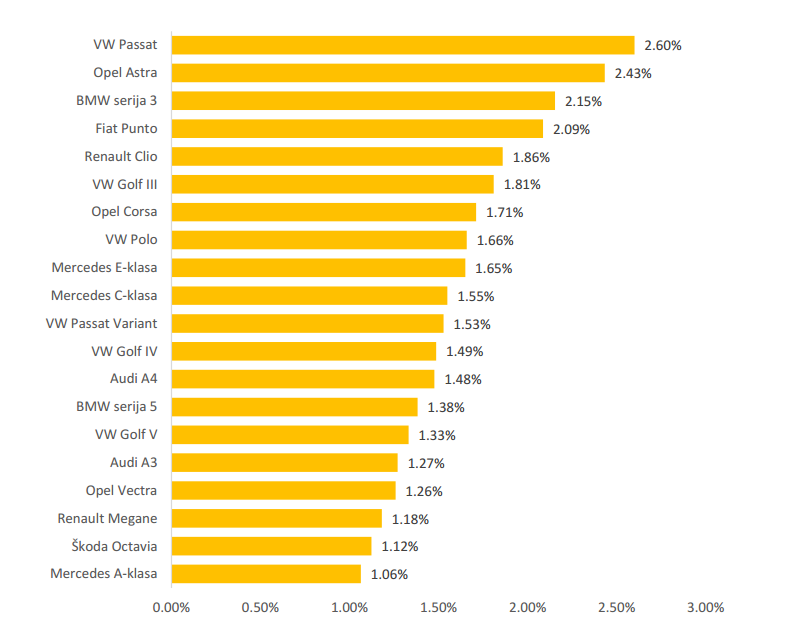 Najveća ponuda osobnih automobila na Njuškalu su oni proizvedeni od 2000. do predrecesijske 2008. godine, ukupno 51 posto ponude osobnih automobila.