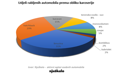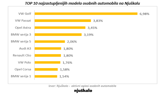 Samo u lipnju kod nas je predano gotovo 15 tisuća novih oglasa rabljenih automobila te se trenutno može birati između 63 različite marke i 791 različitog modela rabljenih automobila koji se prodaju. Prosječna prijeđena kilometraža tih automobila iznosi 159 tisuća kilometara, dok je prosječna starost istih 10 godina. Najzastupljenije marke automobila koji se na Njuškalu prodaju su Volkswagen, BMW i Renault, dok je, kada pogledamo modele, najviše Golfova, BMW serije 3 te Opel Astre.