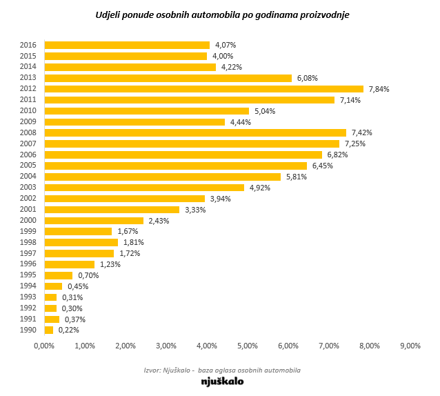 Najveća ponuda osobnih automobila na Njuškalu su oni proizvedeni od 2006. do 2012. godine, ukupno 46 posto ponude. Unutar tog perioda automobili generacije proizvedene 2009. i 2010. godine bilježe manji udio oglašavanih automobila, što je povezano i s padom prodaje novih automobila u Hrvatskoj u tom periodu.