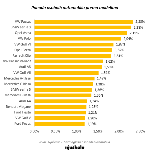 Na Njuškalu je u posljednjih mjesec dana predano više od 13 tisuća novih oglasa osobnih automobila. Potencijalni kupci mogu birati između 63 marke vozila i 779 modela automobila koji se oglašavaju.