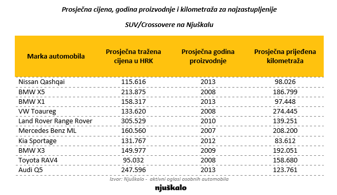 NajzastupljenijI, Nissan Qashqai, na Njuškalu dostiže prosječnu cijenu od 115.616 kuna. Prosječno je star 4 godine s prosječnom kilometražom od gotovo 100.000 km. Najstariji SUV u TOP 10 je Mercedes-Benz ML koji je prosječno star 10 godina i dostiže prosječnu traženu cijenu od 160 tisuća kuna. Prosječna vrijednost VW Touarega na Njuškalu je 133.620 kuna sa prosječnom starosti od 9 godina i prosječno prijeđenih 275 tisuća kilometara. Najpovoljniji model među 10 najzastupljeniji modela je Toyota RAV4 koja prosječno vrijedi 95.032 kune. Toyote RAV4 su prosječno stare 9 godina i prešle su oko 160 tisuća kilometara.