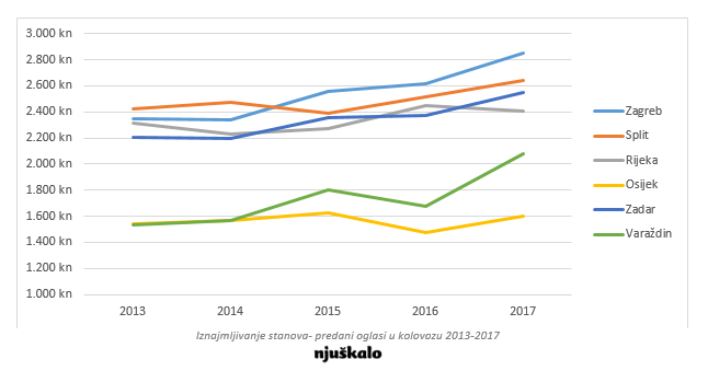 U svim prikazanim gradovima, osim Rijeke, prosječna cijena takvog stana je porasla u odnosu na prošlu godinu. Najveći rast u odnosu na prošlu godinu je imao Varaždin i to za više od 20 posto. Zagreb u odnosu na 2013. godinu ima za 21 posto više cijene najma stana od 50 kvadrata, a samo u odnosu na prošlu godinu cijene su više za 9 posto. Prosječna cijena najma stana od 50 kvadrata u Splitu viša je za oko 5 posto u odnosu na prošlu godinu, dok je u Zadru ta cijena viša za preko 7 posto.