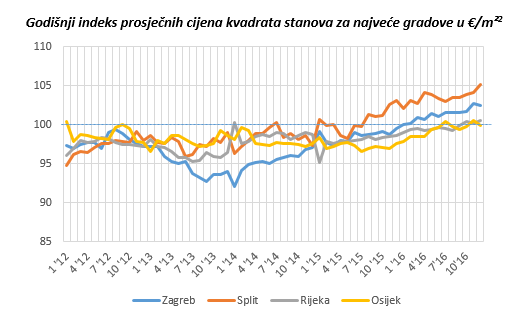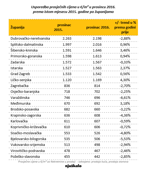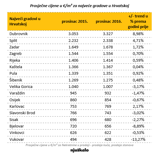 U prosincu 2016. godine po najvećim gradovima u Hrvatskoj, ne uključujući i njihovu okolicu, najviše cijene po kvadratu imaju nekretnine u gradovima na Jadranu - u Dubrovniku, Splitu i Zadru.