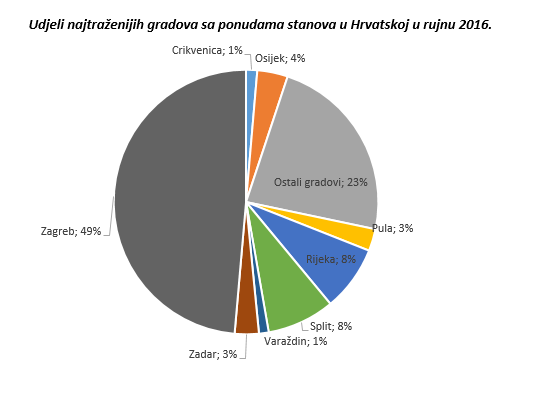 Dubrovnik je i dalje najskuplji grad s godišnjim rastom cijena nekretnina od visokih deset posto. Slijede ga Opatija, Bol na Braču te grad Hvar. Po najvećim gradovima u Hrvatskoj, ne uključujući i njihovu okolicu, najviše cijene po kvadratu imaju nekretnine u gradovima na Jadranu - u Dubrovniku, Splitu i Zadru. Najnižu prosječnu cijenu nekretnine i dalje ima grad Vukovar, u kojemu je cijena kvadrata ispod 500 eura. Od najvećih gradova u Hrvatskoj, najveći pad cijena nekretnina pokazuje Bjelovar s padom od 9 posto na godišnjoj razini te Vukovar s padom od 4 posto. U rujnu, stanovi u prodaji pokazuju najveći interes pretraživanja od svih kategorija nekretnina s više od 5,3 milijuna detaljnih prikaza oglasa potencijalnih kupaca iz Hrvatske i inozemstva. Slijede kuće u prodaji te sezonalni rast pretraživanja stanova za iznajmljivanje.