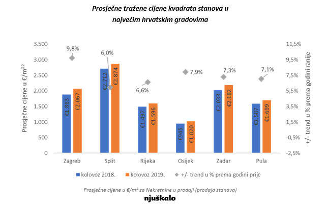Prema novom istraživanju Njuškala, provedenom na uzorku većem od 160 tisuća aktivnih oglasa u kolovozu 2019. godine, tražene cijene nekretnina u Hrvatskoj pokazuju godišnji rast od gotovo 7 posto. U posljednjih 12 mjeseci, tražene cijene stanova više su za 9 posto, dok su tražene cijene kuća skočile za nešto više od 4 posto. Usporedimo li ih s onima iz 2017.godine, rast je još izraženiji. Tako su tražene cijene stanova u Hrvatskoj u 24 mjeseca bilježile rast od 17 posto, dok su cijene kuća u istom periodu rasle za gotovo 9 posto.