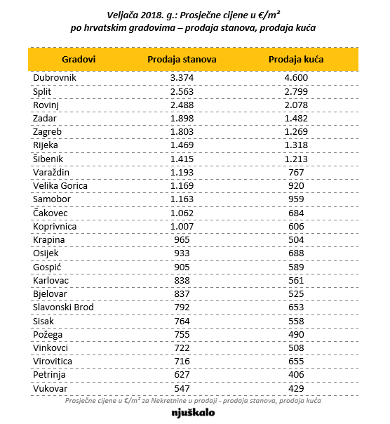I dalje je prisutan ubrzani rast cijena stanova u najvećim hrvatskim gradovima, pa su tako cijene stanova u Puli više za 12 posto u odnosu na isti period prošle godine, dok su cijene stanova u Zagrebu skočile za 8 posto i ovog puta prešle 1.800 eura po kvadratnom metru. Dok cijene stanova u nekim gradovima u Slavoniji, poput Đakova i Slavonskog Broda, bilježe pad i po 5 posto u odnosu na isto razdoblje prošle godine, istovremeno u Osijeku i Vinkovcima cijene stagniraju. Prosječna cijena kvadrata stana u Osijeku iznosi 933 eura, dok u Vinkovcima ona iznosi 722 eura.