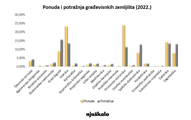 Kad usporedimo ove nove trendove u potražnji sa ponudom, jasno je vidljivo da tržište „ne zadovoljava“ sve zahtjeve kupaca. Tako je ponuda građevinskih zemljišta puno veća od potražnje u Primorsko-goranskoj županiji te u Istarskoj, a istovremeno je u odnosu na potražnju nedostaje u Zagrebu, Zagrebačkoj županiji te na obali u Splitsko-dalmatinskoj županiji.