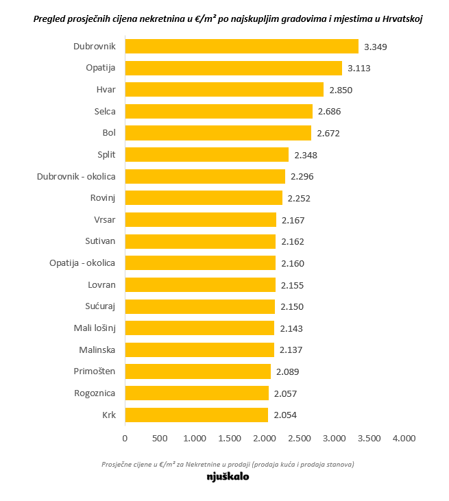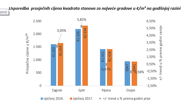 Od najvećih gradova u Hrvatskoj, cijene stanova najviše rastu u Splitu te u Zagrebu. Rijeka također pokazuje blagi oporavak cijena stanova, dok Osijek nastavlja sa stagnacijom cijena kvadrata stana. Rast cijena stanova zabilježili su i gradovi Zadar i Pula.