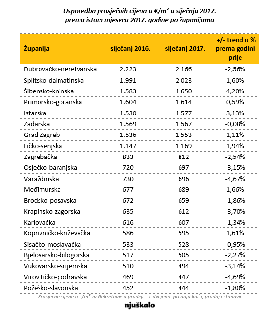Većina županija na godišnjoj razini pokazuje pad u prosječnim cijenama nekretnina, koji je i dalje najizraženiji u kontinentalnom dijelu Hrvatske, dok su cijene u većini županija u priobalju tijekom siječnja nastavile s oporavkom cijena na godišnjoj razini.