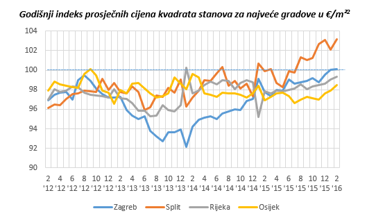 Prema novom istraživanju Njuškala, provedenom na uzorku od 151 000 nekretnina oglašenih u ožujku 2016. godine, cijene nekretnina u Hrvatskoj pokazuju pad od 0,33 posto prema istom mjesecu prošle godine. Najnoviji podaci uspoređeni sa cijenama u ožujku 2011. godine, pokazuju pak njihov pad za 6 posto. Ipak, u prvom kvartalu 2016. godine u Zagrebu je zaustavljen trend pada prosječnih cijena kvadrata stanova. Rijeka i Osijek bilježe manji pad cijena stanova u periodu od godinu dana (godišnji indeks ispod 100), dok u Splitu cijene i dalje rastu iz mjeseca u mjesec (godišnji indeks iznad 100).