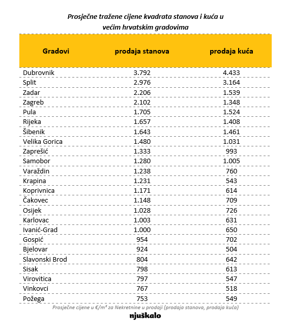 U Gradu Zagrebu je prosječna tražena cijena kvadrata stana u siječnju iznosila 2.102 eura, odnosno čak 21 euro više u odnosu na raniji mjesec, te čak 114 eura više u odnosu na siječanj prošle godine, što predstavlja rast na godišnjoj razini od gotovo 6 posto. Istovremeno, Split bilježi osjetniji rast; u siječnju je prosječna tražena cijena kvadrata stana tamo iznosila 2.976 eura, što je za 180 eura više nego isti mjesec prošle godine, odnosno rast od 6,4 posto.