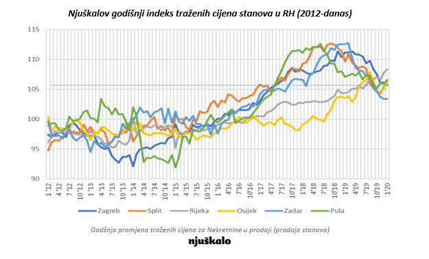 Iako je rast prisutan u svim najvećim hrvatskim gradovima, on bilježi usporavanje, što nam zorno prikazuje i Njuškalov godišnji indeks traženih cijena stanova.