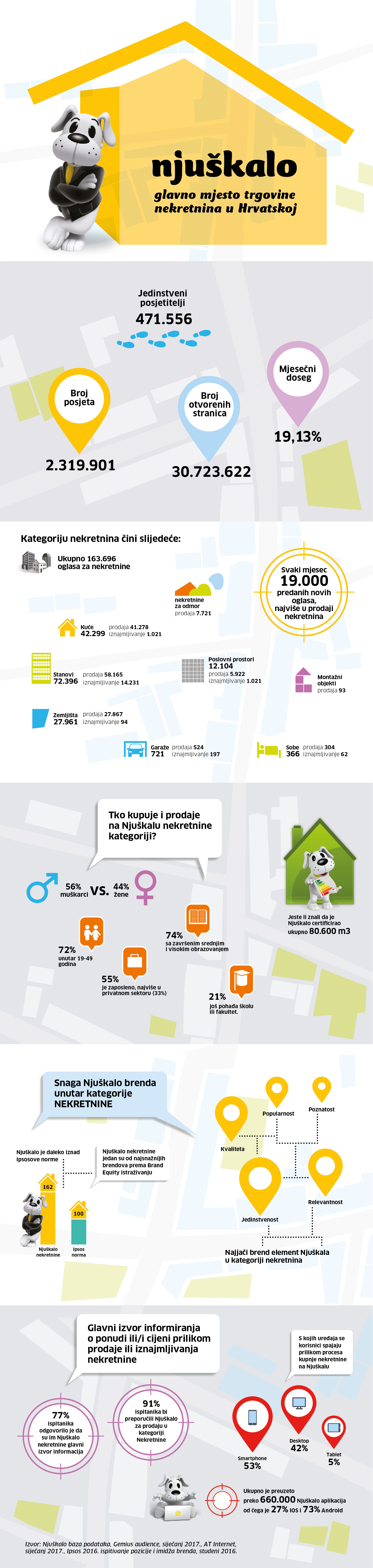 Njuškalo je glavno mjesto za trgovanje nekretninama u Hrvatskoj. S više od 470 tisuća jedinstvenih posjetitelja kategorija Nekretnine ostvaruje mjesečni doseg od 19,13 posto. U velikoj anketi među internet korisnicima, čak 77 posto ih je odgovorilo da im je Njuškalo glavni izvor informiranja o cijenama prilikom prodaje i/ili iznajmljivanja nekretnine.