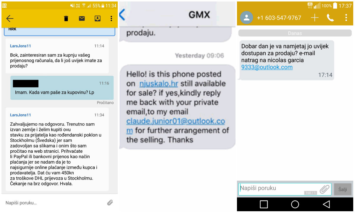 Potencijalni kupac se, u tim slučajevima, javio nekim od digitalnih kanala koji prodavač koristi kao kontakt za oglas (npr. chat, SMS, e-mail) i obavijestio da je zainteresiran za kupnju predmeta koji je oglašen te tražio dodatne informacije. Prvi razlog za sumnju na prijevaru je bio kontakt na stranom jeziku ili lošem hrvatskom ( budući da usluga Google prevoditelja još nije savršena). U ovakvom slučaju dovoljno je zapitati se ima li osoba u Engleskoj ili Njemačkoj zaista potrebu kupiti stolić, igraću konzolu ili čak automobil koji se prodaje u Hrvatskoj?