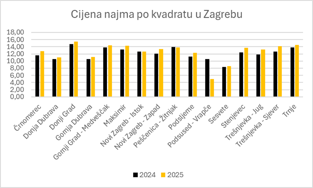 Prosjek traženih cijena za stan u Vijencu Ivana Meštrovića narastao je 39% pa se ove godine tamo mjesečno izdvaja 506 eura. Vatrogasno naselje ima najveći skok prosjeka jer se ondje za najam prošle godine prosječno tražilo 210 €, dok danas taj prosjek iznosi čak 543 eura. Za Gornji grad/Centar ove godine prosjek cijena porastao je za 23% i prešao prošlogodišnjih prosječnih 461 € pa su sada tražene cijene 566 €. Retfala bilježi isti trend rasta, prošlogodišnjih 436 € za mjesečni najam ove godine poraslo je na 568 eura. Najviše cijene su za Cvjetno naselje u kojem je cijena najma s prošlogodišnjih 500 € mjesečno narasla na 650 €, a za Uske njive također se izdvaja više od 600 eura mjesečno.