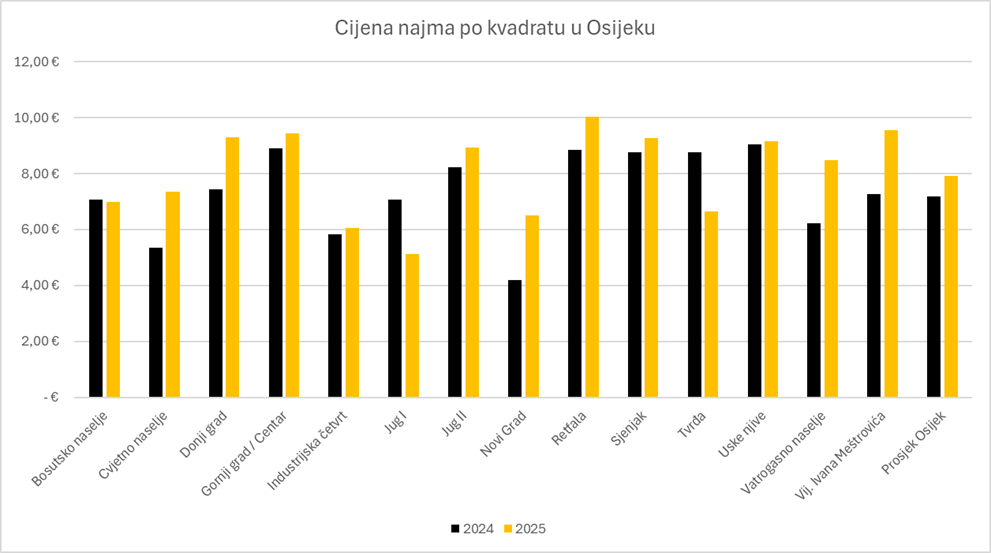 Osijek ima najveći prosječni rast cijena najma od čak 20% kada se uspoređuju prošla i ova godina. U prošloj godini se za Osijek prosječno trebalo izdvojiti 405 € za mjesečni najam, dok se ove godine taj iznos popeo na 487 eura. Najveći prosječni pad najamnina je za Tvrđu i to za 25%, pa je tako ondje najam ove godine bio najjeftiniji od svih osječkih naselja s prosječnom traženom cijenom od 411 eura. Kvartovi u Osijeku u kojima ćete mjesečni najam plaćati manje od 400 eura mjesečno su Jug I i II. Iako bilježe blagi rast prosječno traženih cijena za stan na Jugu I izdvajat će se prosječno 346 €, a na Jugu II 360 eura. Naselja s mjesečnim prosjekom manjim od 450 eura su još Bosutsko (421 €) koje ima rast traženih cijena od 36% u odnosu na prošlu godinu, Industrijska četvrt (421 €) i Novi Grad (448 €). Ispod 500 eura za mjesečni najam izdvaja se na Sjenjaku (457 €) i Donjem gradu (490 €).