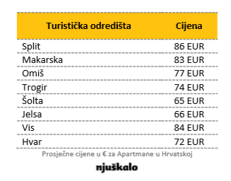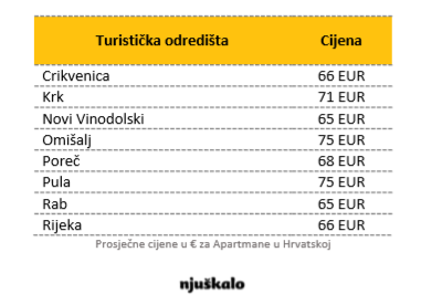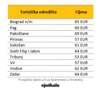 Najveća ponuda privatnog turističkog smještaja je u Sjevernoj Dalmaciji, te Kvarneru i Primorju. Nudi se više vrsta turističkog smještaja, među kojima je najviše apartmana, no može se naći i cijelih kuća, kao i soba. Cijene variraju od oko 20 eura do čak oko 500 eura za dan najma. Prosječna dnevna cijena najma turističkog apartmana u Hrvatskoj na Njuškalu u sezoni iznosi 67 eura, što je za 4 eura više u odnosu na prošlu godinu. Prema podacima kojima raspolažemo, prosječna cijena najma turističkog apartmana izvan sezone u prosjeku iznosi 46 eura, što je za 31 posto povoljnije nego u sezoni.