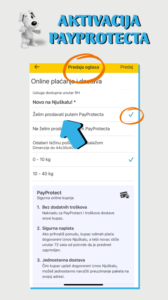 Kod predaje oglasa označi polje „Želim prodavati putem PayProtecta“. Za aktivne oglase, to možeš napraviti klikom na „Uredi“.